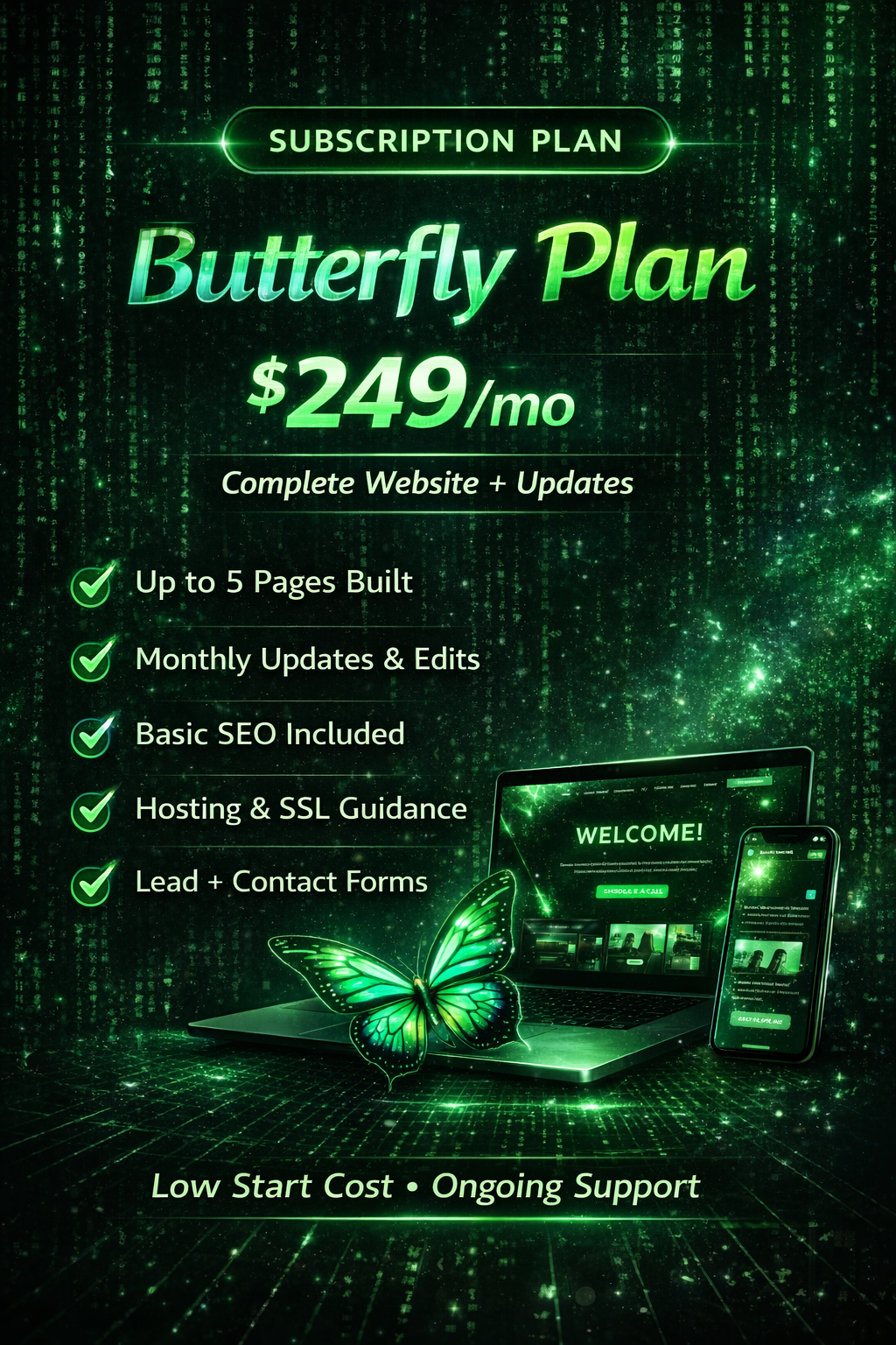 Design + build + launch. If you want, we can also manage updates and improvements.